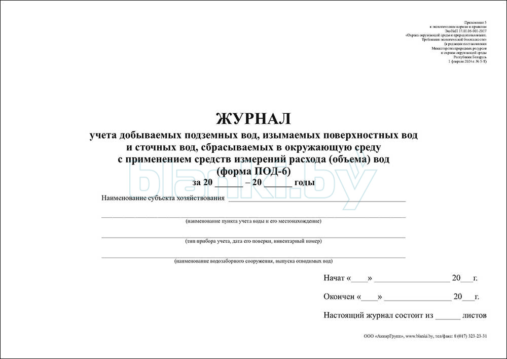 - инструментальным методом (с применением средств измерений расхода (объема) вод) - форма ПОД-6 «Журнал учета добываемых подземных вод, изымаемых поверхностных вод и сточных вод, сбрасываемых в окружающую среду с применением средств измерений расхода (объема) вод»;