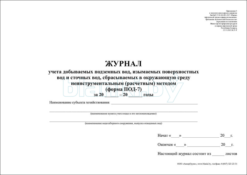 ПОД-7 Журнал учета добываемых подземных вод, изымаемых поверхностных вод и сточных вод, сбрасываемых в окружающую среду неинструментальным (расчетным) методом