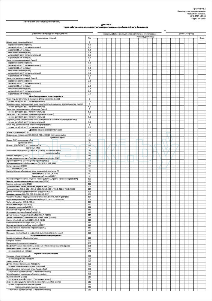 - Дневник учета работы врача-специалиста стоматологического профиля, зубного фельдшера Форма №039/у;