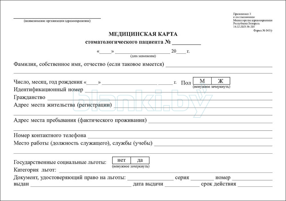 Постановление Министерства здравоохранения Республики Беларусь № 203 от 16.12.2025 "Об установлении форм медицинских документов в стоматологии и порядке их заполнения"