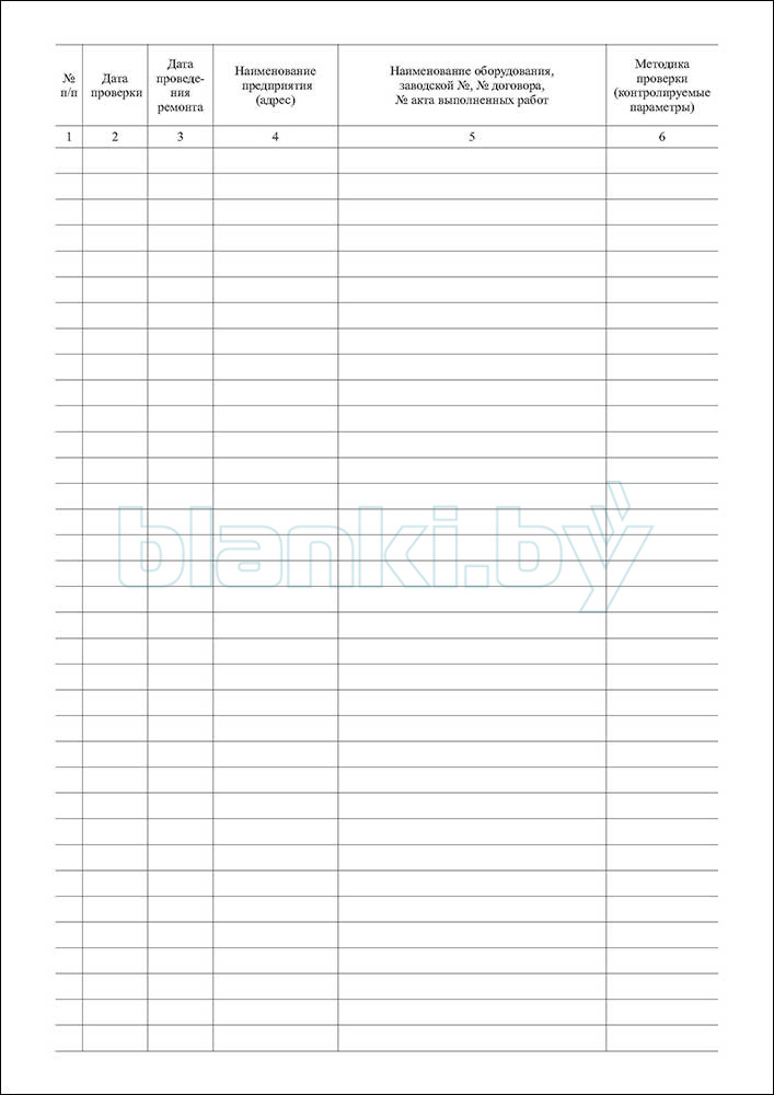 Журнал имеет 11 колонок, в которых заполняется информация о том, когда и кем ремонтировалось оборудование, фиксируются данные о том, как оно проверялось после ремонта (методика проверки), отмечается лицо, которое отвечает за проверку оборудования после ремонта.